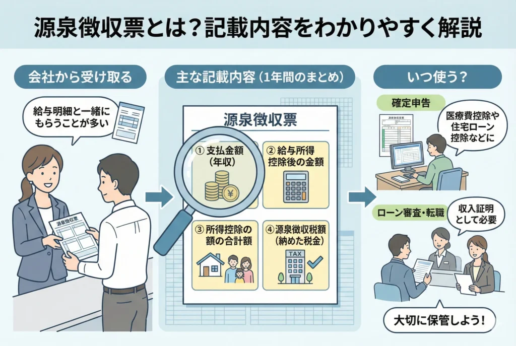 ここでは、源泉徴収票とは何か、記載されている内容や発行時期について詳しく解説します。