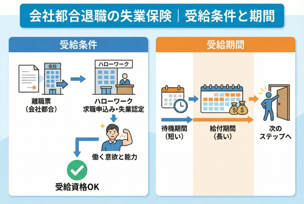 会社都合退職の場合、失業保険の受給条件は自己都合退職よりも緩和されています。受給できる期間も長く設定されているため、次の就職先を見つけるまでの生活を安定させやすいのが特徴です。ここでは、具体的な受給条件と給付日数について詳しく解説します。