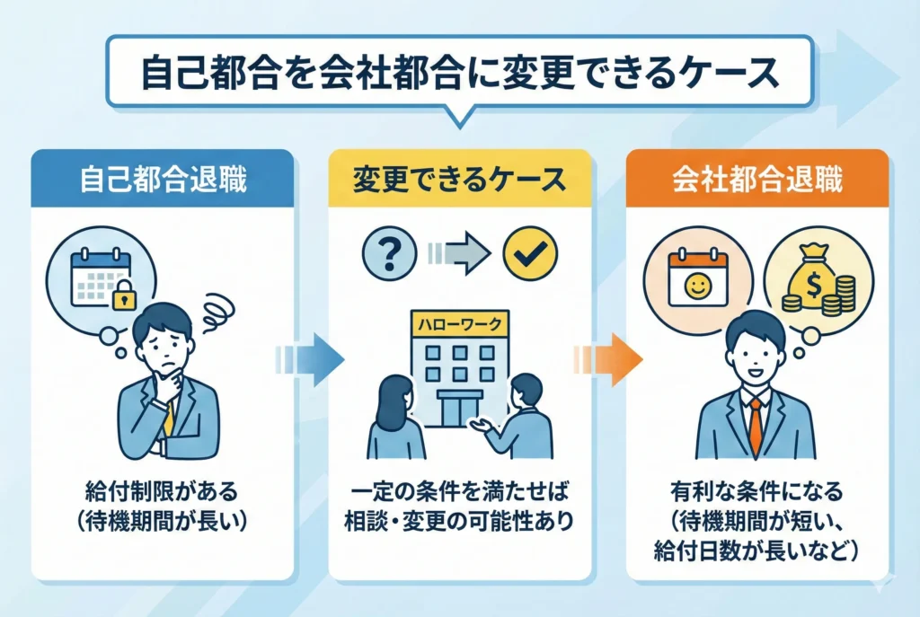 自己都合退職を会社都合退職に変更してもらう最終手段が、ハローワークにおける異議申立ての手続きです。自己都合退職という処理に納得がいかないときは、ハローワークに相談してください。