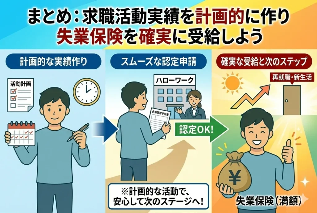 本記事では、失業保険を受給するために必要な求職活動実績について、定義から具体的な作り方、注意点まで詳しく解説してきました。最後に、重要なポイントを振り返っておきましょう。