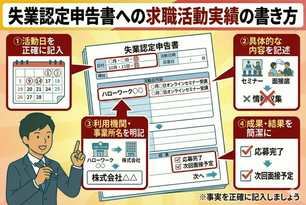 いずれの場合も、失業認定申告書には事実のみを正確に記入することが大切です。活動した日付やセミナー名などを忘れないよう、カレンダーやメモに記録しておく習慣をつけておきましょう。