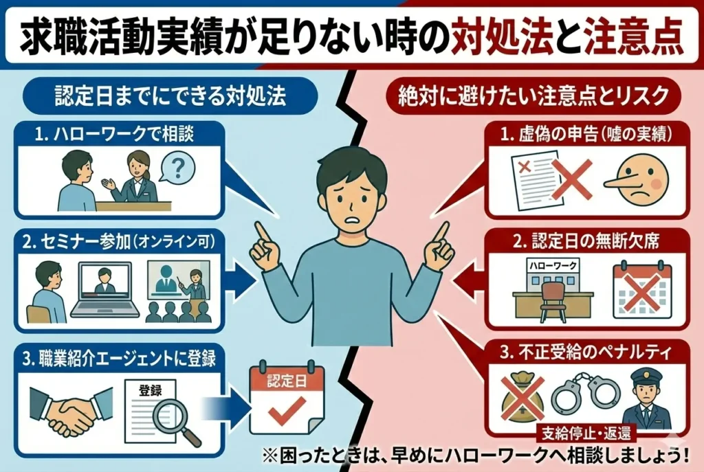「気づいたら認定日が明日なのに実績が足りない」という状況に陥ることは珍しくありません。しかし、焦って虚偽の申告をすると、取り返しのつかない事態を招く可能性があります。ここでは、求職活動実績が足りない場合の影響と正しい対処法、絶対に避けるべき不正行為について解説します。