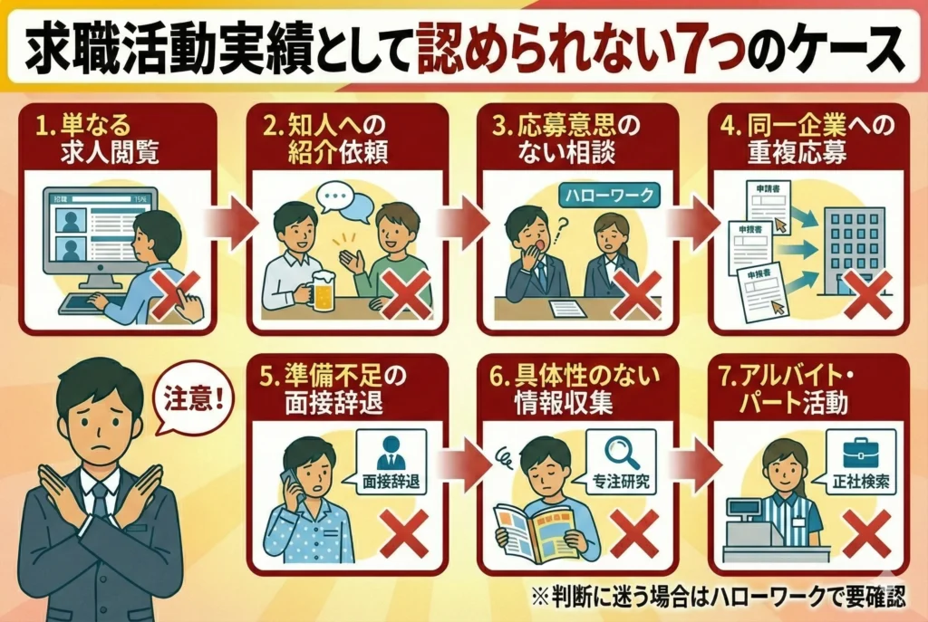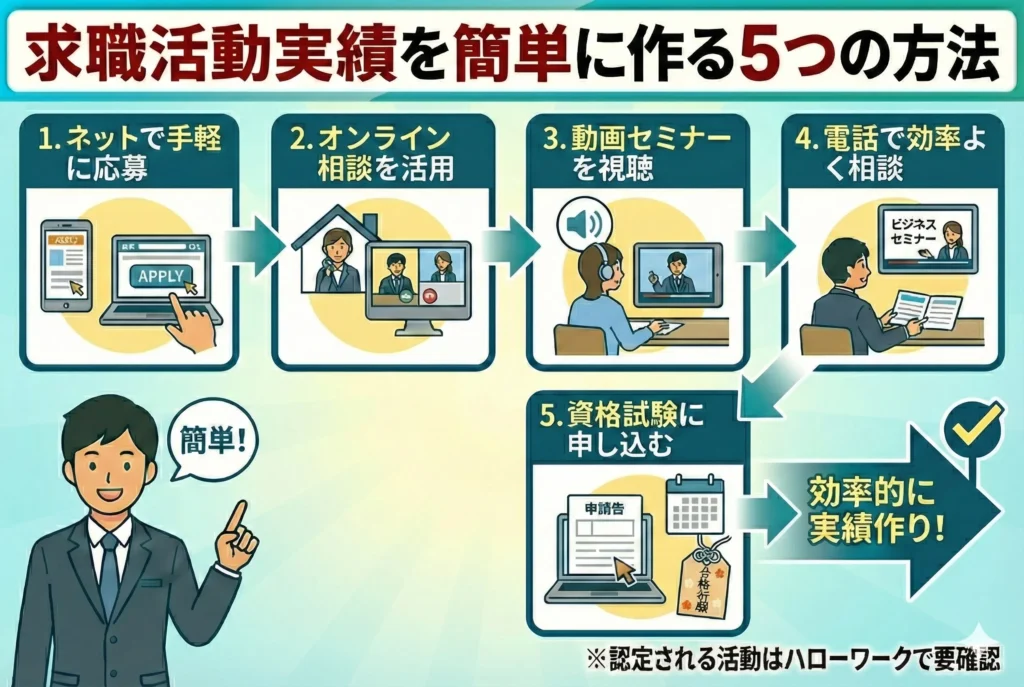 いずれの場合も、「登録だけ」「閲覧だけ」「問い合わせだけ」では実績にはなりません。応募・相談・受講など、具体的なアクションを起こして初めて求職活動実績として認められることを覚えておいてください。