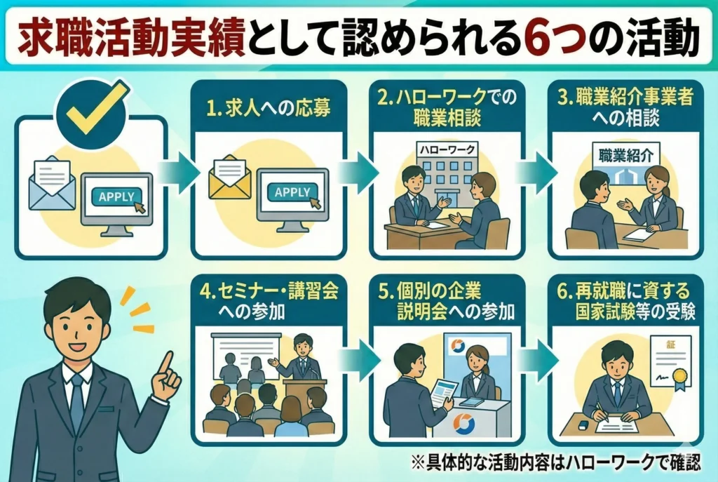 失業保険を受給するためには、ハローワークが定める基準を満たした求職活動を行う必要があります。ここでは、求職活動実績として認められる6つの活動について、それぞれの特徴や注意点を詳しく解説します。