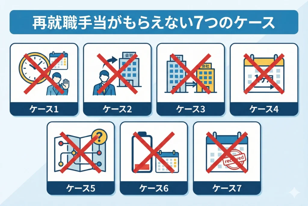 「申請したのにもらえなかった」という事態を避けるために、ここでは再就職手当がもらえない代表的な7つのケースを解説します。該当するものがないか、事前に確認しておきましょう。