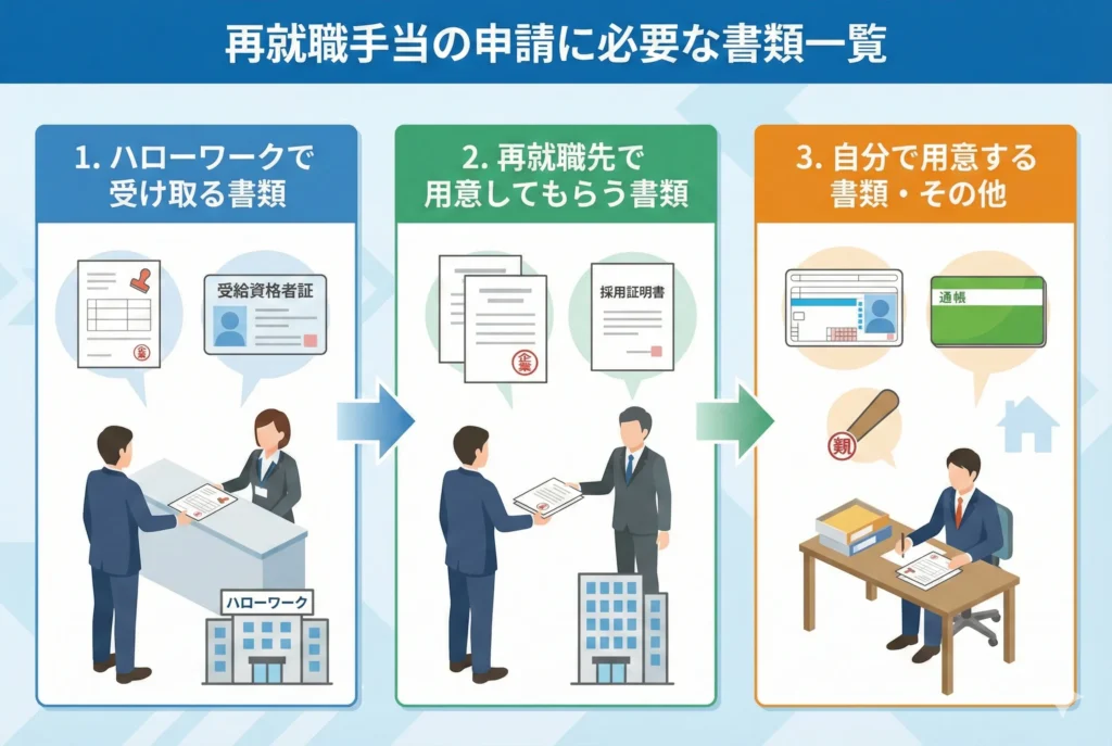 再就職手当を申請するには、複数の書類を揃える必要があります。書類の中には自分で記入するものだけでなく、再就職先に記入してもらうものもあるため、早めに準備を進めることが大切です。