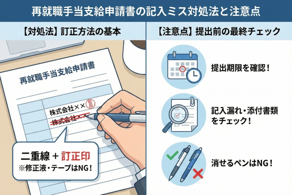 申請書に記入ミスをしてしまった場合、修正液や修正テープを使いたくなるかもしれません。しかし、再就職手当支給申請書では修正液・修正テープの使用は認められていません。