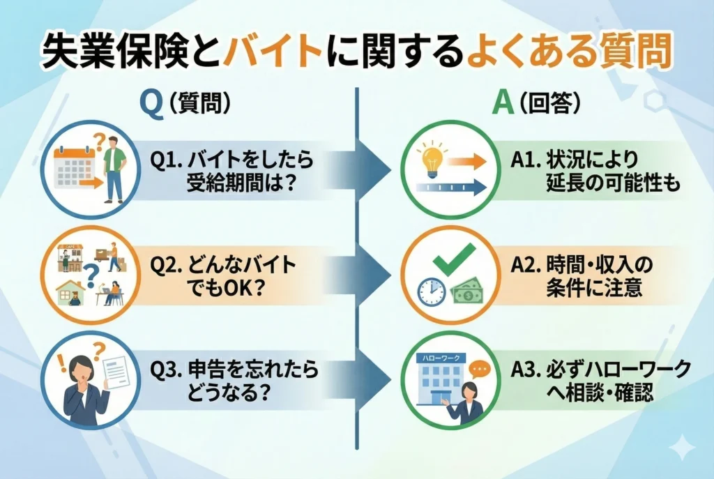 失業保険を受給しながらバイトをする際、細かなルールや例外的なケースについて疑問を持つ方は多いでしょう。ここでは、特に多く寄せられる質問についてわかりやすく回答します。