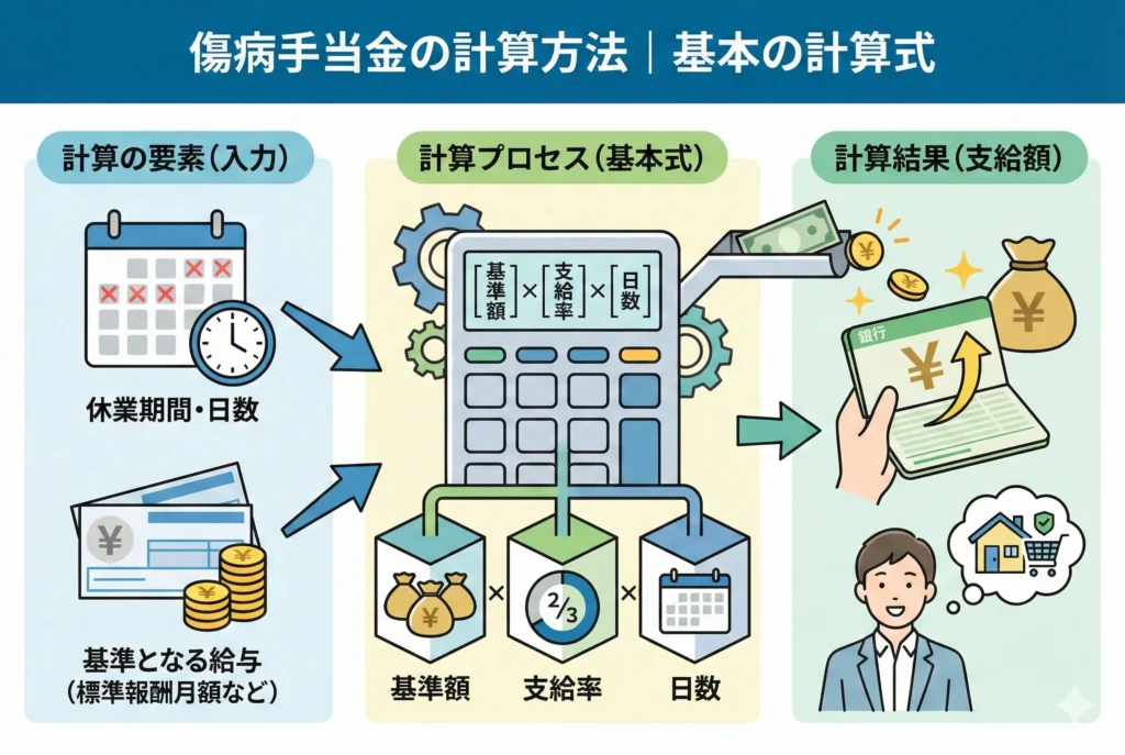 傷病手当金の1日あたりの支給額は、以下の計算式で算出されます。