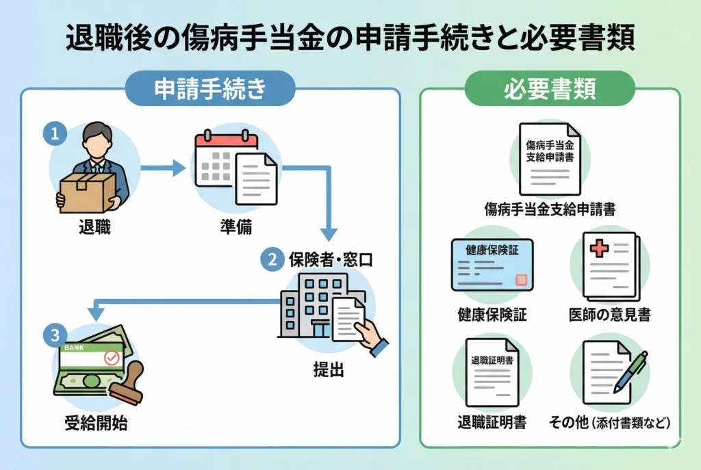 退職後に傷病手当金を受給するためには、正しい手順で申請手続きを行う必要があります。在職中は会社が手続きを代行してくれることが多いですが、退職後は基本的に自分自身で申請を行わなければなりません。