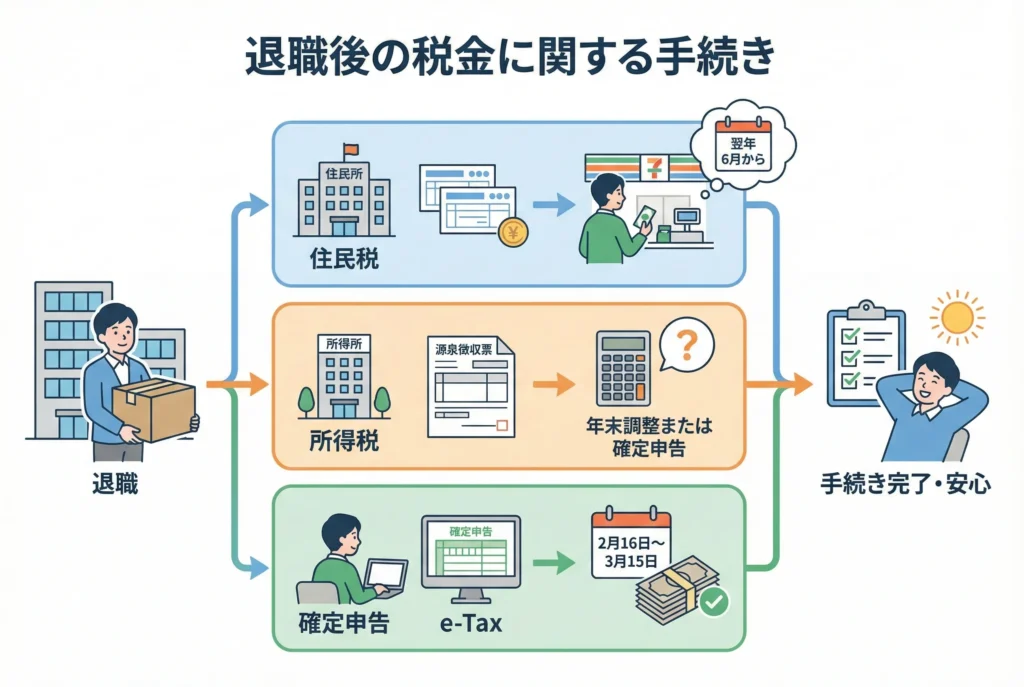 退職月までの住民税は給与から天引きされ、翌月以降の分は普通徴収に切り替わります。市区町村から納付書が届くので、期限までに自分で納付しましょう。