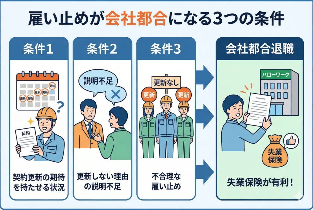 ただし、注意すべき点が1つあります。最初から「契約の更新はしない」と明示されていた場合や、労働者本人が更新を希望していなかった場合は、この条件には該当しません。あくまで「更新の可能性があると説明を受けていた」にもかかわらず更新されなかったことが前提条件です。