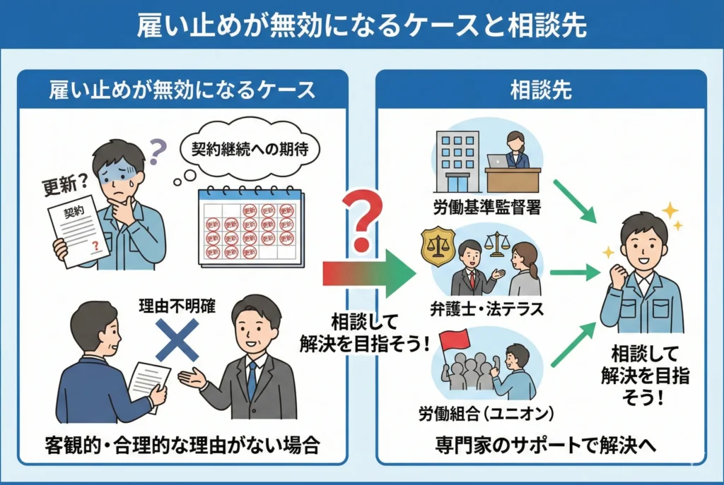 ここでは、雇い止めが無効と判断される2つの要件と、雇い止めに関する悩みを相談できる窓口について解説します。