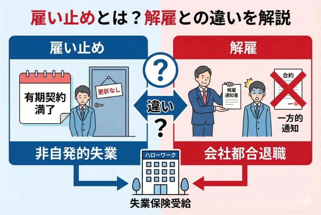 雇い止めされた場合、それが会社都合に該当するのかどうかは、失業保険の受給条件に大きく影響します。しかし、そもそも「雇い止め」という言葉の意味や、似た用語である「解雇」「契約満了」との違いを正しく理解していない方も少なくありません。