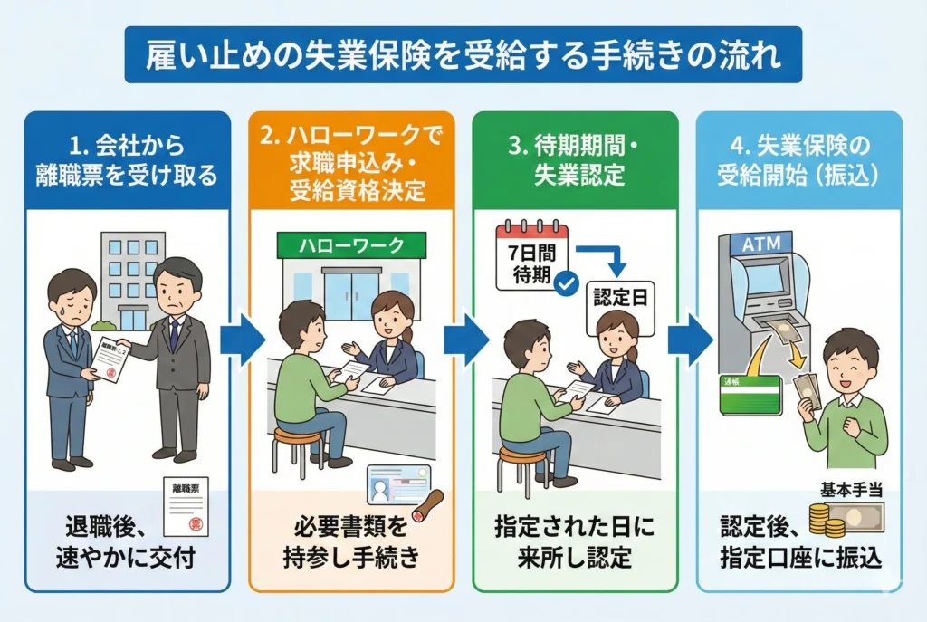 雇い止めで離職した場合、失業保険(雇用保険の基本手当)を受給するには、所定の手続きを順番に進める必要があります。手続きの流れを事前に把握しておけば、退職後にスムーズに行動でき、受給開始の遅れを防ぐことができます。